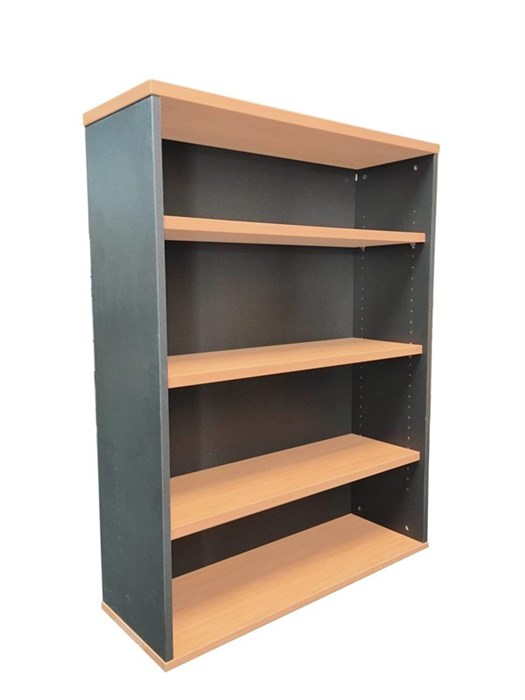 1200mm H Open Bookcase - Beech and Ironstone Includes 3 x 25mm T Adjustable Shelves 900mm W x 315mm D x 1200mm H E0 Rated Melamine Board 25mm T Horizontal Pieces + 18mm T Vertical Pieces 5 Year Warranty