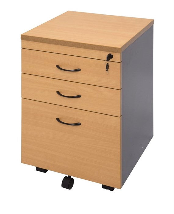 Melamine Mobile Pedestal - Beech and Ironstone 2 Personal Drawers + 1 File Drawer 447mm W x 465mm D x 690mm H Lockable With Metal Runners E0 Rated Melamine Board Black P/C Bow Handles 5 Year Warranty