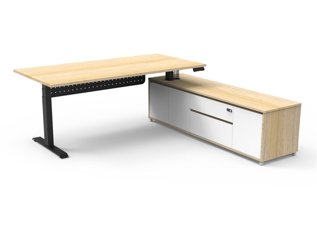 Boost Plus Executive Desk *RIGHT* Hand Side Configuration With Modesty Panel - Natural Oak/ Black Satin Desk: 1800mm W x 900mm D x 620mm - 1270mm H Side Cabinet: 1800mm W x 500mm D x 520mm H Table Top Finished In Natural Oak With Matching Edge Tape - No Cable Entry Holes Or Scallops Includes Arch Perforated Steel Modesty Panel Finish In Black P/C - 1300mm W x 300mm H Side Cabinet Finished With Natural Oak Carcass - Natural White Drawer And Door Fronts Fitted With Black P/C Legs 2 x Pull Out Drawers 1 x Double Swing Door Cupboard 1 x Single Swing Door Cupboard With Adjustable Shelf Soft Close Hinges And Runners Drawers Fitted With Cyberlock 4 Digit Manual Combination Lock Boost Plus Height Adjustable Dual Motor Underframe Finished In Black Satin Powder Coat Digital Control Panel With 3 Pre-Set Positions, LED Display Panel, Keypad Safety Lock & Reminder Alarm Setting Anti- Collision & Anti-Tilt Technology Column Size: 90mm x 60mm Lifting Capacity: 120 Kg Max Speed: 38mm Per Second Adjustable Leveling Feet 1 x T Foot With 700mm W Foot Plate - 1 x Adjustable Leveling Foot Plate Steel Gauge: 3.0mm, 2.0mm & 1.5mm Used Throughout Max Speed: 38mm Per Second Noise Emission: <50DB Surge Immunity: 1kV(L1 to L2) / 2kV(L1,L2 To PE) ESD Protection: +-4.0kV ( Contact Discharge )/+-8.0kV ( Air Discharge ) Input Power: 110-240V Transformer Power:128W (.03W On Standby ) SAA and C Tick Certification 10 Year Warranty