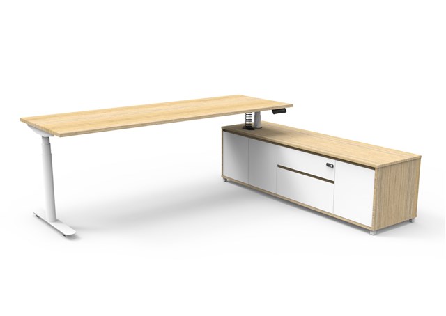 Halo Plus Executive Desk *RIGHT* Hand Side Configuration - Natural Oak/ White Satin Desk: 2100mm W x 750mm D x 620mm - 1270mm H Side Cabinet: 1800mm W x 500mm D x 520mm H Table Top Finished In Natural Oak With Matching Edge Tape - No Cable Entry Holes Or Scallops Side Cabinet Finished With Natural Oak Carcass - Natural White Drawer And Door Fronts Fitted With White P/C Legs 2 x Pull Out Drawers 1 x Double Swing Door Cupboard 1 x Single Swing Door Cupboard With Adjustable Shelf Soft Close Hinges And Runners Drawers Fitted With Cyberlock 4 Digit Manual Combination Lock Halo Plus Height Adjustable Dual Motor Underframe Finished In White Satin Powder Coat Digital Control Panel With 3 Pre-Set Positions, LED Display Panel, Keypad Safety Lock & Reminder Alarm Setting Anti- Collision & Anti-Tilt Technology Column Size: 70mm Dia Lifting Capacity: 120 Kg Max Speed: 38mm Per Second Adjustable Leveling Feet 1 x T Foot With 700mm W Foot Plate - 1 x Adjustable Leveling Foot Plate Steel Gauge: 3.0mm, 2.0mm & 1.5mm Used Throughout Max Speed: 38mm Per Second Noise Emission: <50DB Surge Immunity: 1kV(L1 to L2) / 2kV(L1,L2 To PE) ESD Protection: +-4.0kV ( Contact Discharge )/+-8.0kV ( Air Discharge ) Input Power: 110-240V Transformer Power:128W (.03W On Standby ) SAA and C Tick Certification 10 Year Warranty