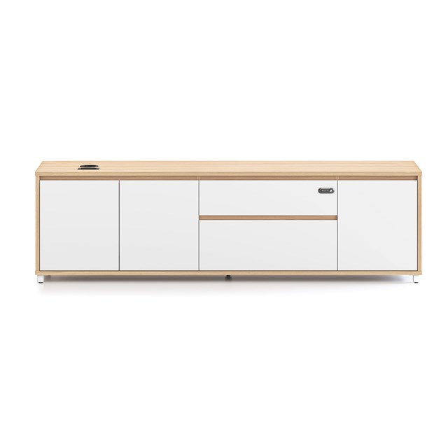 Executive Desk Side Cabinet For Boost And Halo Plus Workstation Frame - Right Hand Side - Natural Oak/Natural White 1800mm W x 500mm D x 520mm H Natural Oak Carcass - Natural White Drawer And Door Fronts Fitted With White P/C Legs 2 x Pull Out Drawers 1 x Double Swing Door Cupboard 1 x Single Swing Door Cupboard With Adjustable Shelf Soft Close Hinges And Runners Drawers Fitted With Cyberlock 4 Digit Manual Combination Lock 5 Year Warranty
