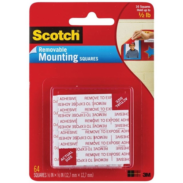 Specifications: Brand: Scotch (3M) Model: 108SML Heavy Duty Type: Double-Sided Mounting Squares Pack Size: 64 adhesive squares Carton Quantity: 6 packs Colour: White Use: Permanent indoor mounting
