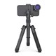 The universal mounting platform includes a built-in smartphone clamp and a standard 1/4"-20 camera screw for mirrorless or DSLR cameras, enhanced by a 360° rotatable ball head for easy composition.