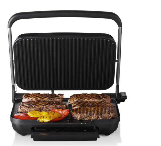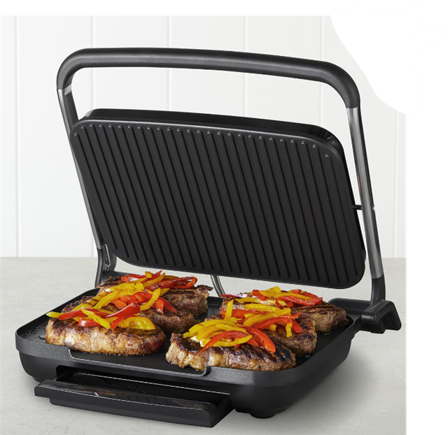 Easy to clean - The non-stick coating and the curved corners of the cooking plates make wiping up oil and crumbs effortless, The built-in drip tray catches fats and juices preventing overflow onto bench tops
