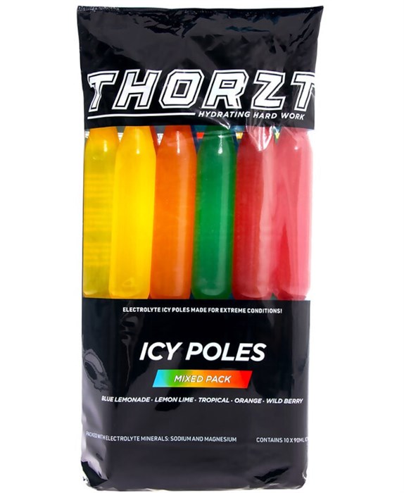 Sodium, Potassium and Magnesium Easy way to treat dehydration associated with heat stress and illness THORZT Icy Poles are a soothing way to rehydrate Available in 5 delicious flavours - Blue Lemonade, Lemon Lime, Orange, Tropical, Wild Berry When frozen, simply snap and twist the Icy Pole, breaking it in half