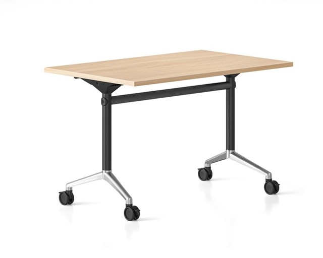 Typhoon Flip Top Table - Natural Oak Top 1200mm W x 600mm D x 750mm H Polished Aluminium Feet, Black P/C Post And Rail Locking Castors E0 Rated Melamine Board 5 Year Warranty