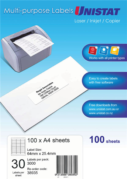 Unistat Multi Use 30UP Labels 100 Box Adelaide Direct Stationers