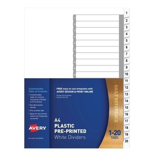 Avery Dividers 1 to 20 Tab PP A4 White